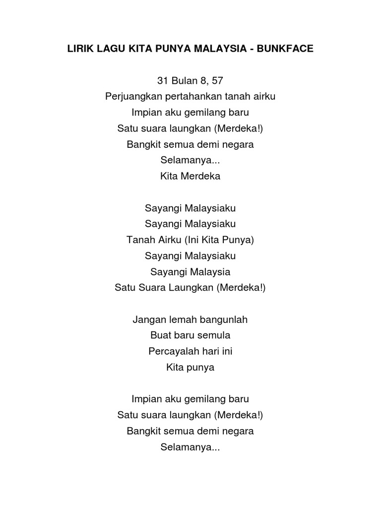 Karangan Sayangi Malaysiaku Sayangi Malaysiaku. 781 reads 25 votes 4 part story. Untuk tahun 2018 lagu Kita Punya Malaysia nyanyian kumpulan Bunkface dan dicipta oleh vokalisnya Sam dijadikan sebagai Lagu tema Hari Kebangsaan 2018.